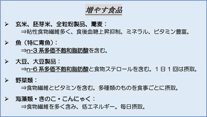 - ⑧ n-3系多価不飽和脂肪酸:中性脂肪の合成を抑制。