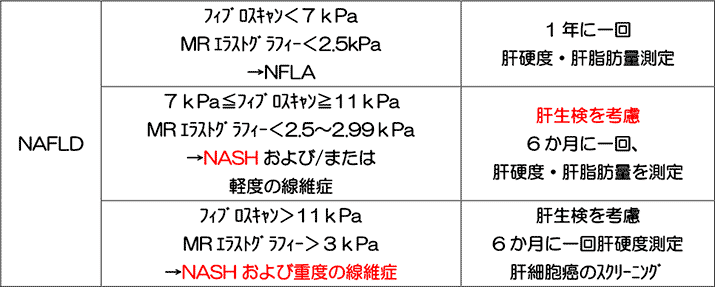 次のステップとして、単なる脂肪沈着のみのNAFL(Nonalcoholic fatty liver)か、肝炎を起こしたNASH(Nonalcoholic steatohepatitis)であるのか、さらに進行した病態としての肝線維化や肝硬変(既に肝癌)であるのかを判断する必要がある。