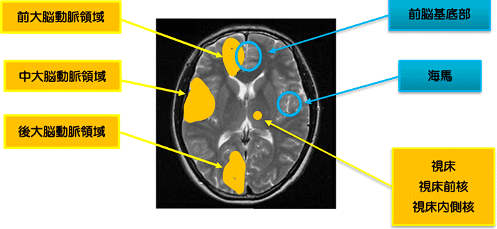 多発性大梗塞で、主幹動脈のアテローム血栓性脳梗塞や心原性脳塞栓症が含まれる。