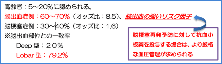 加齢や生活習慣に関連する脳小血管病の代表的変化で、脳血流や自己調節能の低下による、慢性脳虚血や血液脳関門の障害によって生じると考えられている。