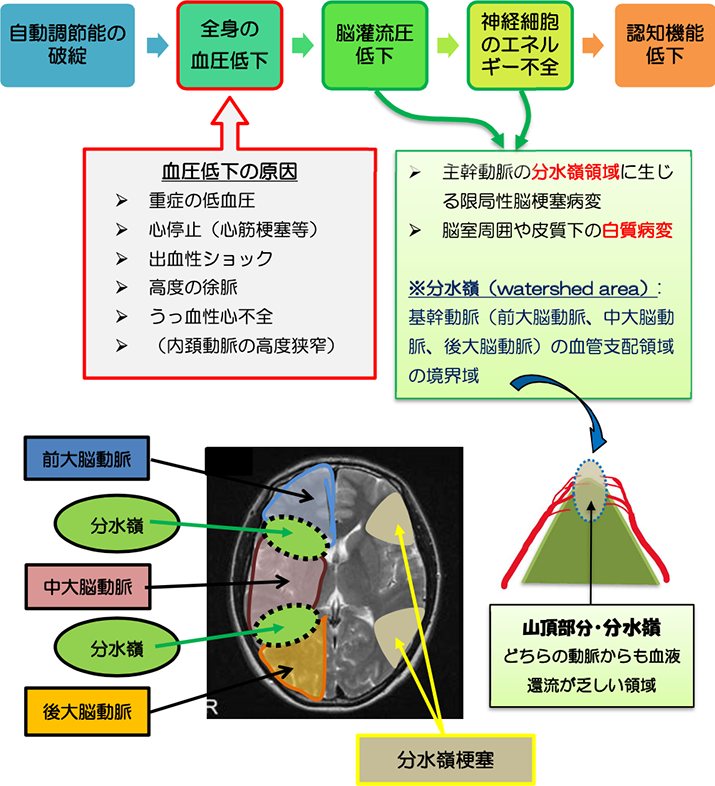 健常な状態の脳では、自動調節能と呼ばれる代償機能によって全身の血圧が低下しても脳の灌流圧は保たれ脳血流は維持されているが、動脈硬化や脳梗塞により自動調節能が破綻すると、全身の血圧低下に伴って脳の灌流圧も低下する。