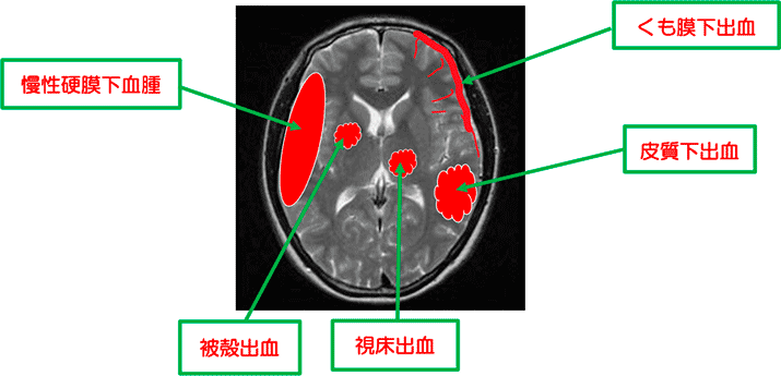 - ① 高血圧性脳出血⇒視床出血、被殻出血
